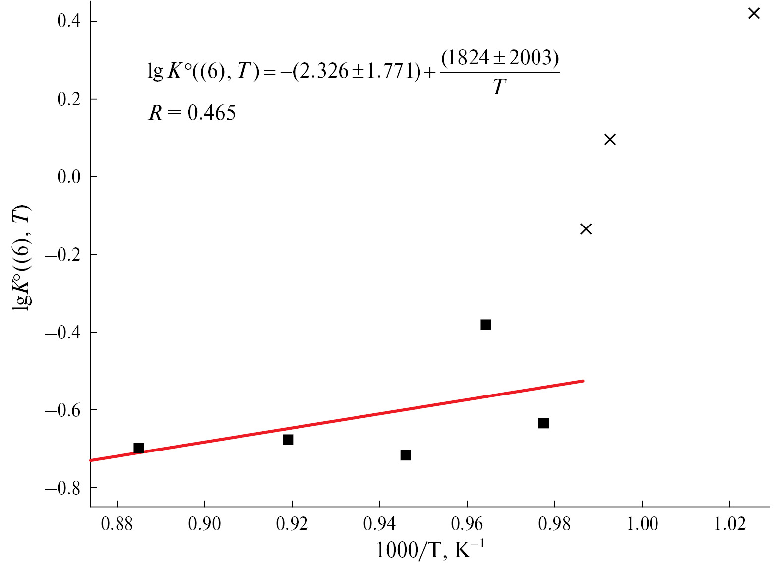 Рис. 2. Зависимость константы равновесия реакции (6) от обратной температуры. В расчетах не использовали точки, обозначенные Х.