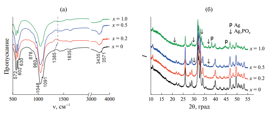 Образцы гидроксиапатита, в которых катионы кальция замещены на катионы серебра, получены механохимическим методом с использованием в качестве источников ионов-заместителей нитрата и фосфата серебра. Полученные образцы исследованы методами рентгеновской дифракции и инфракрасной спектроскопии. Установлено, что при использовании AgNO3 в продуктах синтеза присутствует остаточный нитрат, тогда как применение Ag3PO4 позволяет получить однофазный сереброзамещенный карбонат-гидроксиапатит. Введение катионов серебра в положение катионов кальция увеличивает параметры кристаллической решетки гидроксиапатита.