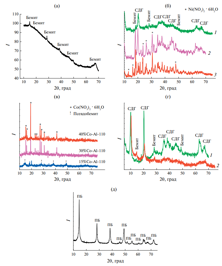 The paper studies the interaction processes of the product of centrifugal thermal activation of gibbsite (CTA-GB) with aqueous solutions of nickel or cobalt nitrate in a wide range of active component concentrations (15–50 wt. %). Using X-ray phase and thermal analysis methods, it was found that the synthesis products are layered double hydroxides and pseudoboehmite. The interaction of CTA-GB in an aqueous medium without nickel or cobalt leads to the formation of pseudoboehmite only. The effect of nickel in solutions is expressed in the complete absence of pseudoboehmite formation. In the case of cobalt, pseudoboehmite formation occurs up to its concentration of 30 wt. %, and above that (40, 50 wt. %) they are also not formed. According to the results of temperature-programmed reduction with hydrogen, the products of heat treatment at 350–850°C are mixed compositions of NiO/nickel aluminate and Co3O4/cobalt aluminate, the transformation of which into spinels of the NiAl2O4 and CoAl2O4 type occurs almost completely at 850°C, and their synthesis based on CTA-GB products is possible without using classical coprecipitation stages (sol-gel technology).