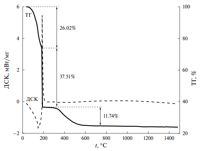 При нагревании прекурсора, полученного золь-гель методом и высушенного при 115°С, происходит постепенное уменьшение массы образца, которое можно связать с изменениями в органической составляющей смеси и ее частичным разложением. На термограмме образца в этом температурном интервале наблюдается начало эндотермического эффекта (рис. 3), который прерывается высоким узким экзоэффектом. При 190–210°С происходит быстрое сгорание цитратов металлов с выделением значительного количества тепла и образованием большого объема газообразных продуктов. Удаление оставшихся продуктов горения органической смеси продолжается до 600°С. Суммарная потеря массы прекурсора составляет 75.27 мас. %. На кривой ДСК в интервале температур 210–1430°С никаких выраженных тепловых эффектов не наблюдается. По-видимому, несмотря на быстрое протекание стадии горения, в реакционной смеси развивается достаточно высокая температура, необходимая для синтеза целевого продукта.