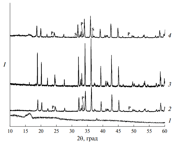 Рис. 4. Дифрактограммы прекурсора PrMgAl11O19, полученного золь-гель методом и отожженного при 1000 (1), 1500 (2), 1600 (3) и 1700°C (4). P – PrAlO3 (перовскит), S – MgAl2O4 (шпинель). Необозначенные пики относятся к фазе PrMgAl11O19 со структурой магнетоплюмбита.
