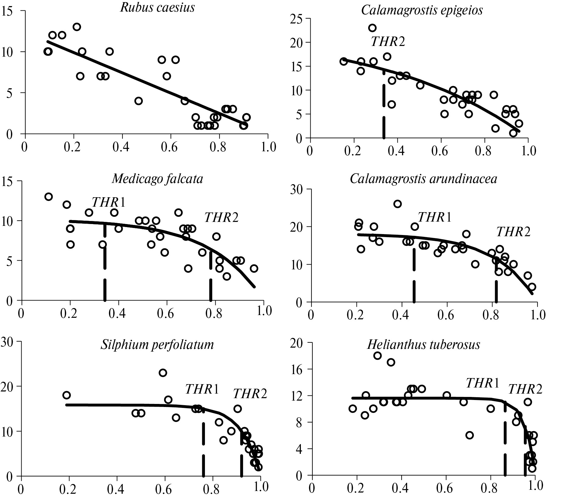 При росте T вид зависимости (1) постепенно приближается к линейному. В этом случае на определенном этапе THR1 и THR2 принимают отрицательные значения. Они означают отсутствие порогов и в работе принимаются равными нулю. Рис. 1 иллюстрирует разные варианты расположения THR1 и THR2 на градиенте D на примере участков сообществ с доминированием Calamagrostis arundinacea (NAT), C. epigeios (NAT), Rubus caesius (NAT), Medicago falcata (DISTa), Silphium perfoliatum (DISTex) и Helianthus tuberosus (DISTex).