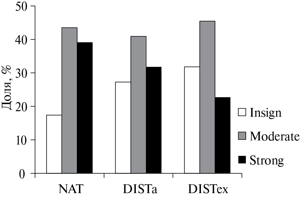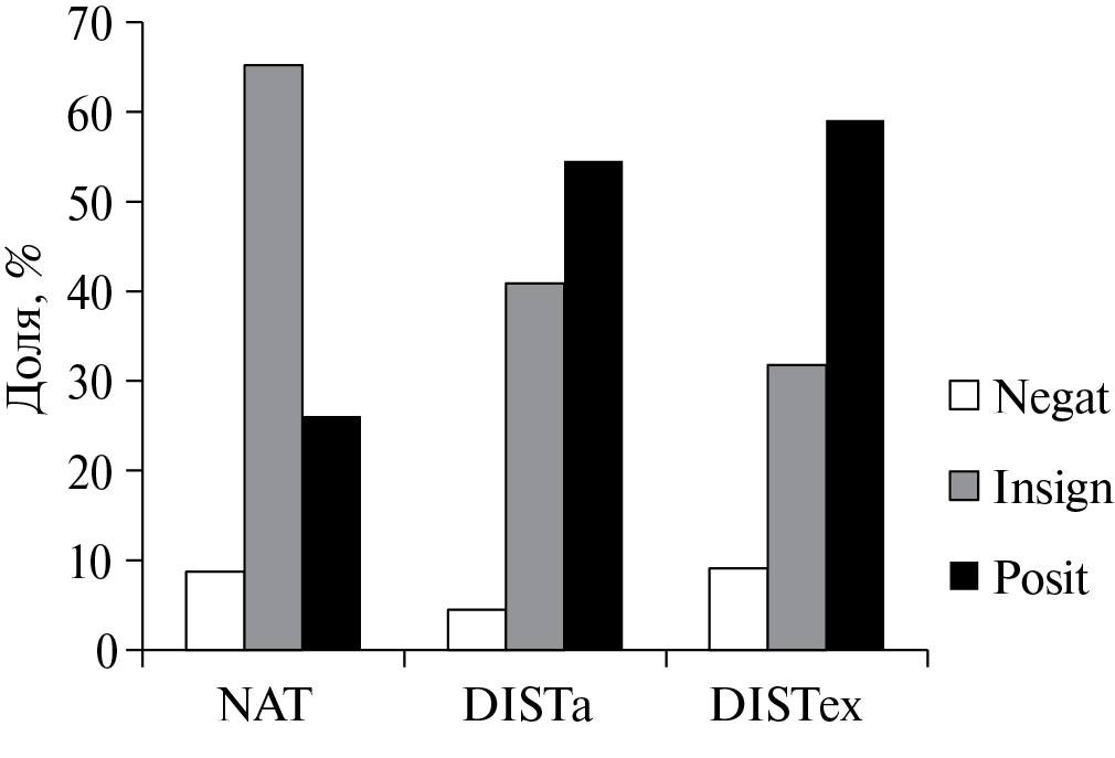 Рис. 2. Гистограммы соотношения изученных естественных (полуестественных) и синантропных растительных сообществ с разным характером и теснотой связи между участием доминанта (D) и сырой биомассой на 0.25 м2 (WG). Характер (знак) и теснота связи межу D и WG оценивались с использованием коэффициента корреляции рангов Спирмена (RWD): insign — доля участков с отсутствием статистически значимой (P < 0.05) корреляции между D и WG, negat — доля участков с отрицательными значениями RWD выше критических для P < 0.05, posit — со статистически значимыми (P < 0.05) положительными значениями RWD. Здесь и на рис. 3 и 5: NAT — естественные (полуестественные) сообщества, DISTa — синантропные сообщества с доминированием аборигенных видов, DISTex — синантропные сообщества с доминированием чужеродных видов.
