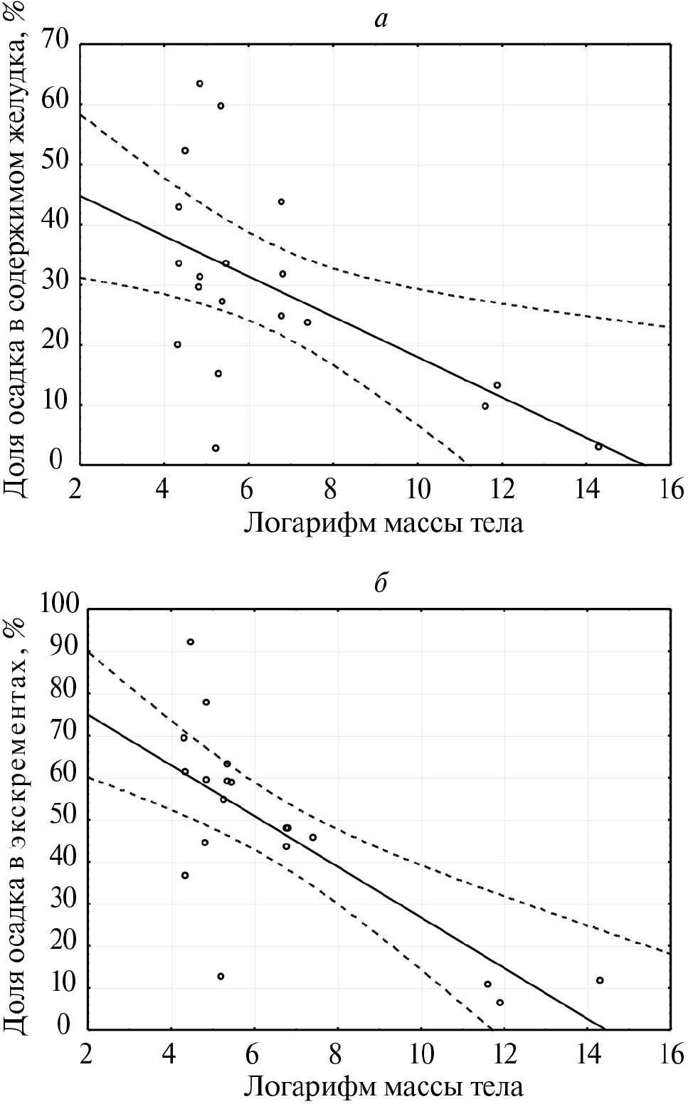 Рис. 11. Корреляция между долей осадка и массой тела: а — в содержимом желудка (r = –0.5579), б — в экскрементах (r = –0.7405).