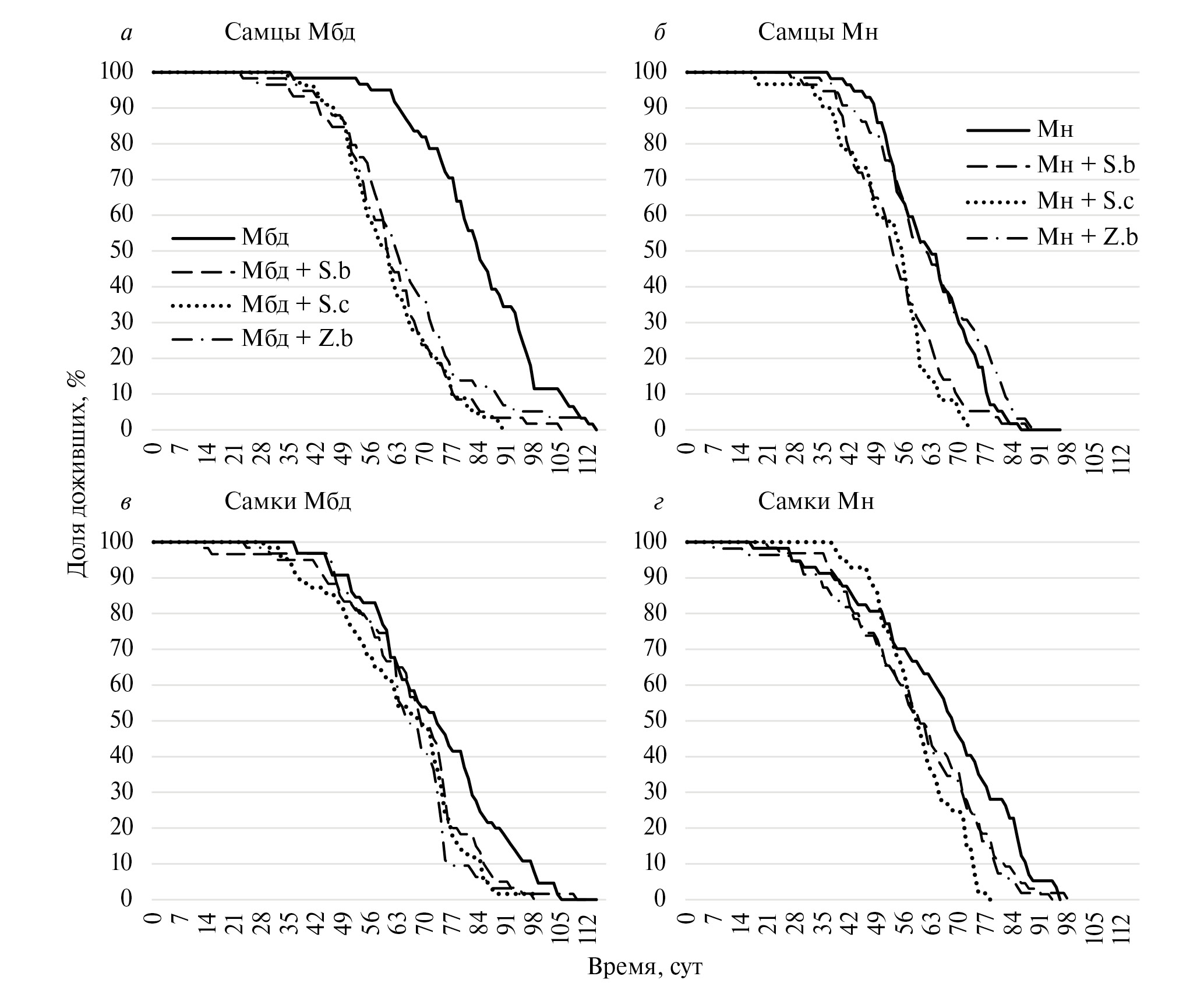 В линии Мбд любой вид подсеянных на корм дрожжей значимо понижает среднюю ПЖ примерно до уровня средней ПЖ контрольных мух (Мн на Н). На корме S.b ПЖ мух Мбд значимо снижается почти на 14 дней, с 78.1 до 64.2 дня (Мбд на S.b по сравнению с Мбд на Н). При этом “добавление” своего естественного микробиома значимо снижает среднюю ПЖ еще почти на 7 дней, с 64.2 до 57.4 дня (Мн на S.b по сравнению с Мбд на S.b, различия статистически значимы). ПЖ мух Мбд на корме с подсевом пекарских дрожжей (S.c) значимо снижается более чем на 15 дней (Мбд на S.c по сравнению с Мбд на Н), а добавление еще и естественного микробиома значимо сокращает жизнь на 7 дней дополнительно (Мн на S.c по сравнению с Мбд на S.c, различия статистически значимы). Средняя ПЖ мух Мбд на корме Z.b значимо снижается примерно на 13 дней (Мбд на Z.b по сравнению с Мбд на Н), а добавление к подсеву дрожжей естественного микробиома мух сокращает жизнь еще примерно на 4 дня, однако различие средней ПЖ не достигает уровня статистической значимости (Мн на Z.b по сравнению с Мбд на Z.b).