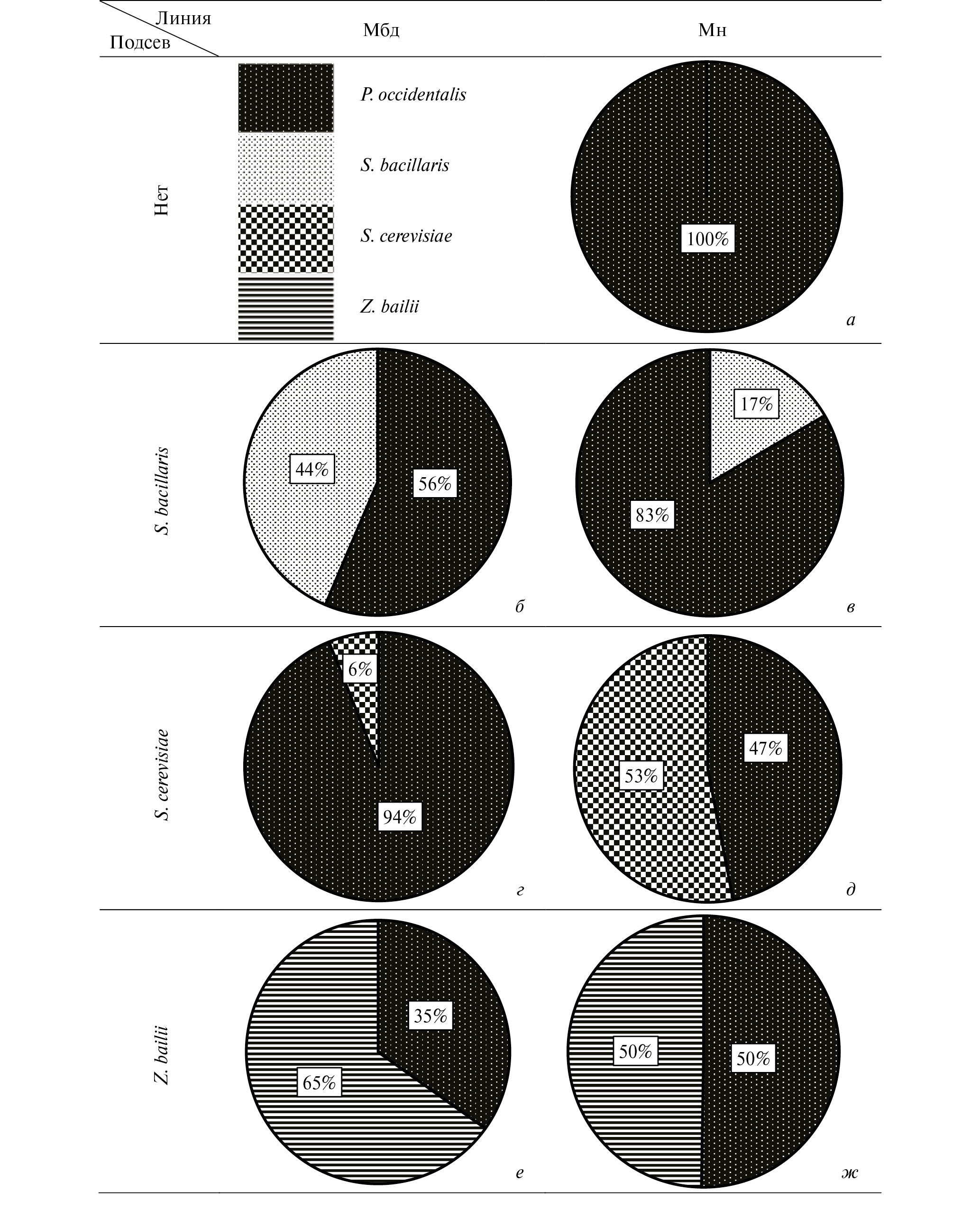 Для того чтобы проверить, как влияет подсев дрожжей на представителей разного пола, мы пронормировали ПЖ самок и самцов во всех вариантах теста с подсевом дрожжей на “базовую” ПЖ, т. е. ПЖ самок и самцов соответствующих линий, тестируемых на корме Н без подсева. Благодаря дисперсионному анализу и тесту Ньюмена–Кейлса удалось подтвердить описанные выше наблюдения: средняя ПЖ самцов из линии Мбд снижается при всех видах подсева значимо сильнее, чем средняя ПЖ самок. Для линии Мн эффект на ПЖ самцов и самок от подсева дрожжей S. bacillaris и S. cerevisiae не различается, а при подсеве дрожжей Z. bailii средняя ПЖ самцов снижается не так сильно, как средняя ПЖ самок.
