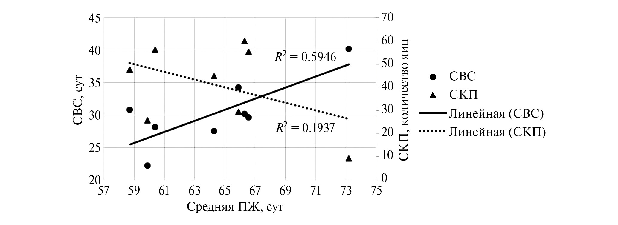 Таблица 2. Средний возраст самки, откладывающей яйца (СВС), и суммарный коэффициент плодовитости (СКП)