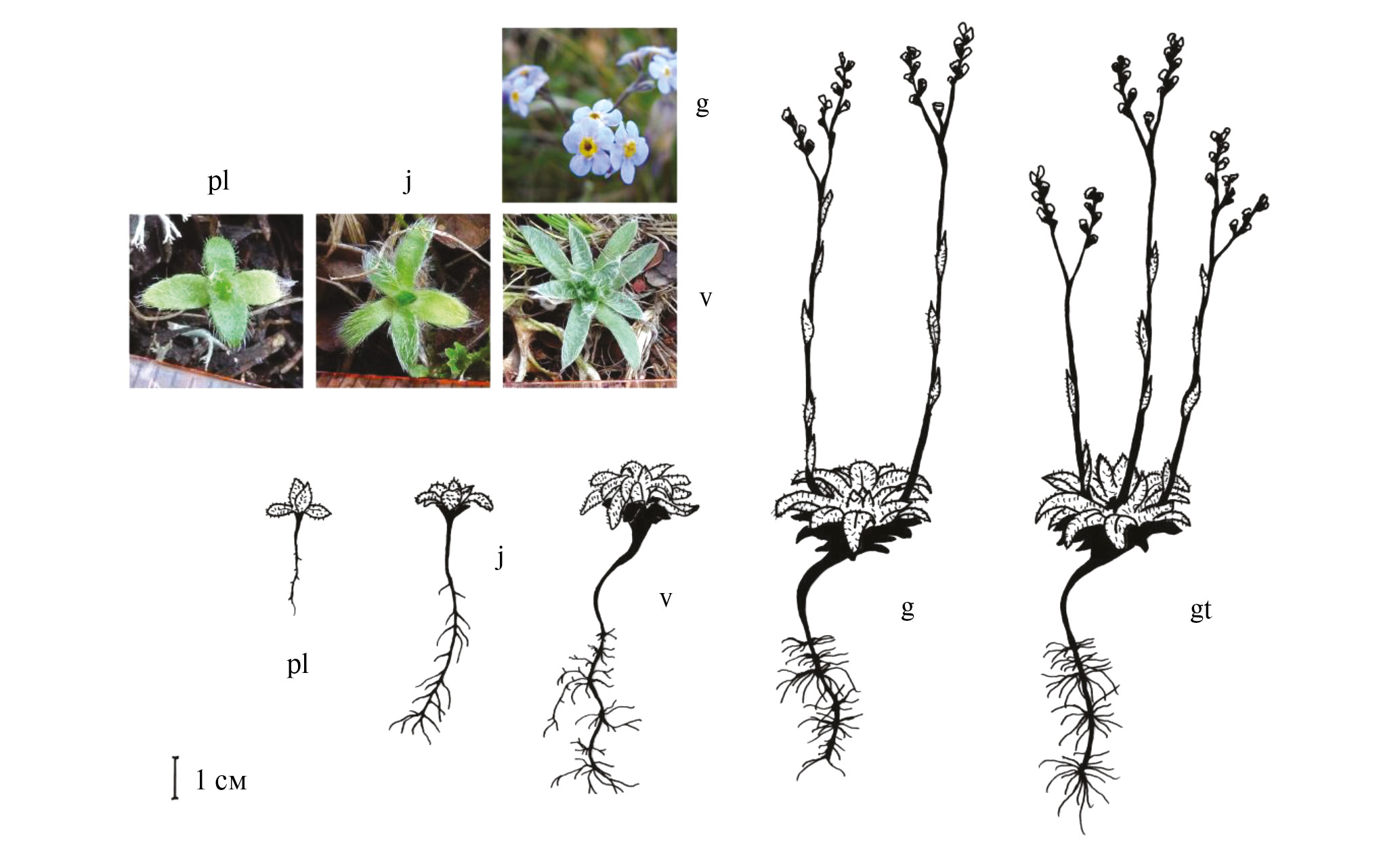 Рис. 2. Шкала онтогенеза альпийского малолетника Eritrichium caucasicum: pl – проростки, j – молодые особи, v – взрослые вегетативные растения, g – генеративные, gt – генеративные на стадии последнего цветения (Логофет и др., 2023).