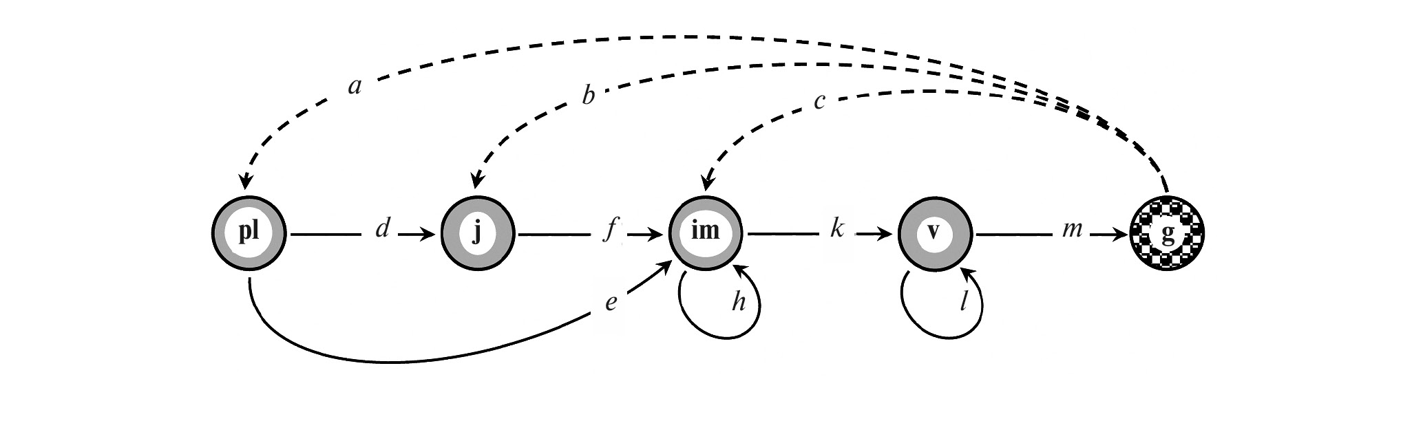 По общей направленности развития особи ГЖЦ воспроизводит шкалу онтогенеза, однако наличие в жизненном цикле нетривиальных задержек в стадиях va и g, возврата va ← g, а также ускоренного перехода va ⮍ gt есть проявление поливариантности онтогенеза (Жукова, 1983, 1986; Жукова, Комаров, 1990) E. caucasicum в условиях альпийского пояса Северо-Западного Кавказа (Логофет и др., 2016). Смысл параметров a, b, …, k, l, m, приписанных дугам ГЖЦ, разъясняется в следующем разделе.