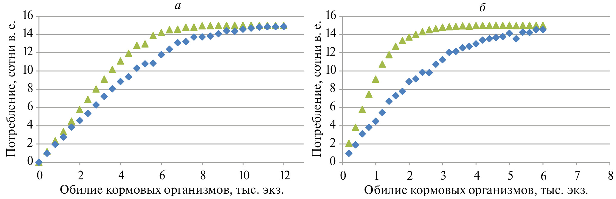 Рис. 3. Зависимость величины рациона рыб от обилия кормовых организмов: а – невозобновляемый корм, б – возобновляемый корм. Ромбы – случайный тип плавания и линейное насыщение, треугольники – векторизованный тип плавания и насыщение линейное с порогом.