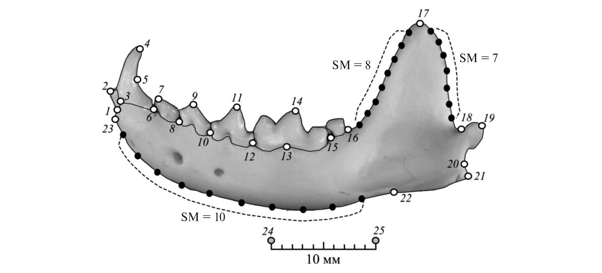 Рис. 1. Локализация меток-ландмарок – LM (1–23), полуландмарок – SM (черные кружки) и масштабирующих ландмарок (24–25) на фотографии нижней челюсти американской норки с буккальной стороны.