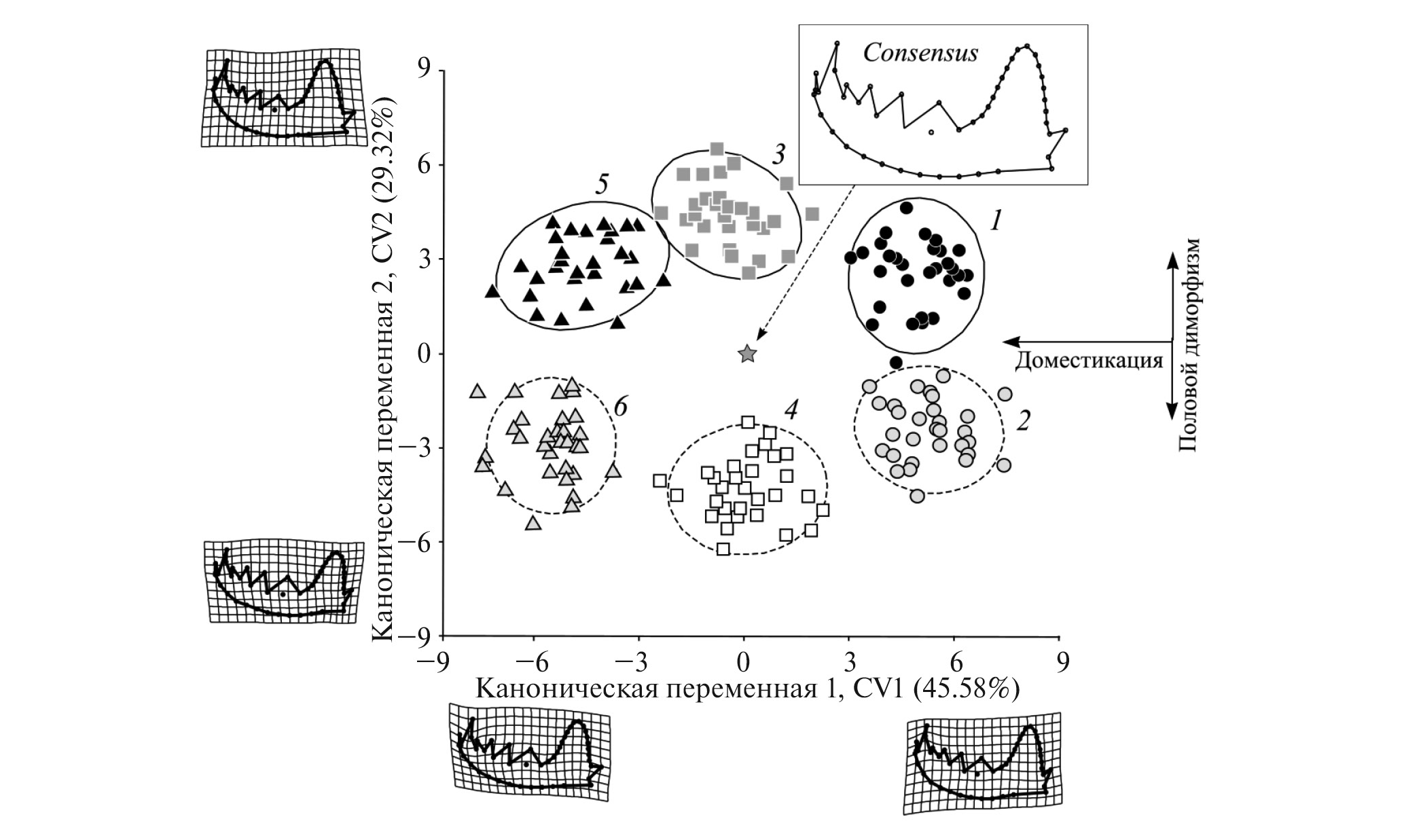Рис. 5. Результаты канонического анализа прокрустовых координат, характеризующих изменчивость формы нижней челюсти самцов (нечетные номера) и самок (четные номера) агрессивных (1, 2), неселектированных (3, 4) и ручных (5, 6) американских норок. Стрелки – направления межгрупповой изменчивости, соответствующие факторам “линия” и “пол”.