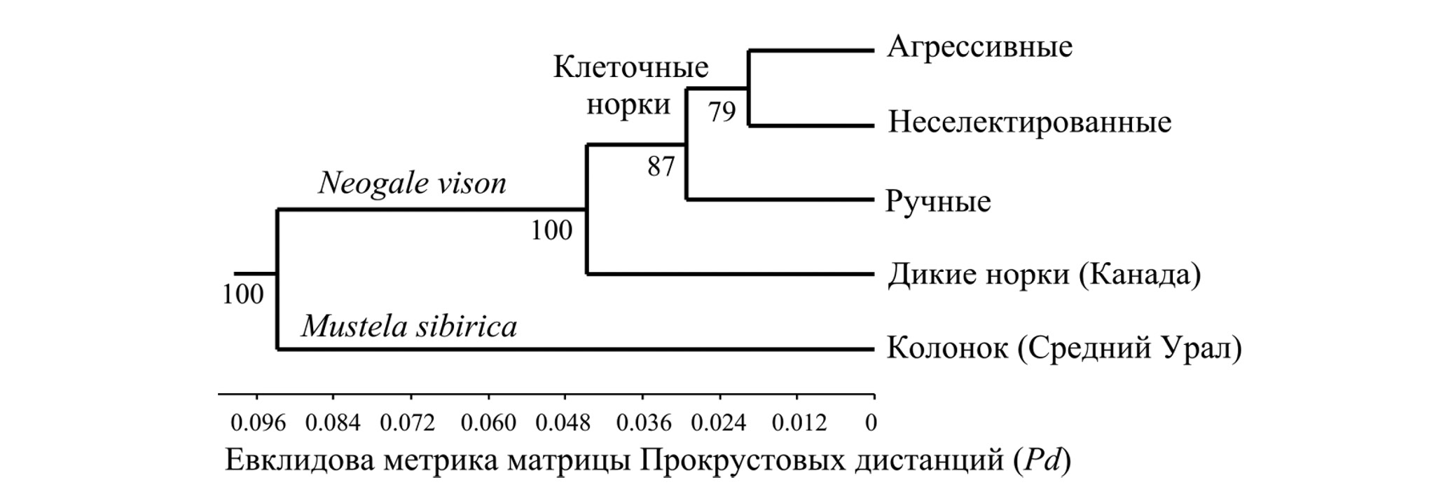 Согласно ранее существовавшему таксономическому критерию – “правилу 75%”, рекомендованному Э. Майром (1971), уровень подвидовых различий мог быть признан уже при 75% корректной дискриминации особей сравниваемых фенонов (однородных в фенотипическом отношении выборок, имеющих общее происхождение). В настоящее время этот формальный критерий уже не применяется и может служить лишь неким количественным ориентиром при оценке уровня внутривидовых морфологических различий. Различия по форме мандибул между клеточными линиями агрессивных и ручных американских норок, между которыми проявился морфологический хиатус, обеспечивают возможность 100% дискриминации их особей, включая самцов и самок. Это прямо указывает на высокий уровень морфологической дифференциации сравниваемых экспериментальных линий, который формально выше, чем 75% Э. Майра. В нашем случае речь не идет о создании “рукотворных” подвидов, но можно заключить, что результаты разнонаправленной селекции американских норок по оборонительному поведению на звероферме привели к быстрому (за относительно малое число поколений) формированию устойчивых изменений морфологии нижней челюсти, формально приближающихся к внутривидовому уровню морфологических различий подвидового ранга.
