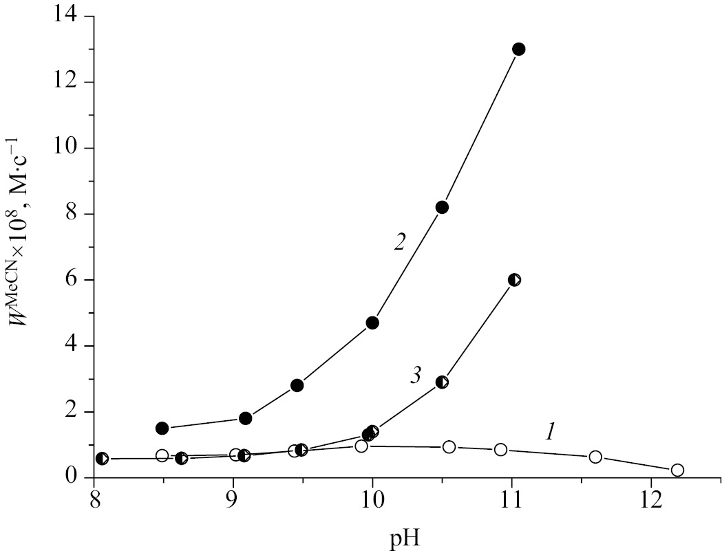 В отличие от водных растворов скорость реакции Et2S с пероксоборатом в смеси Н2О–MeСN (1 об%) экспоненциально растет с увеличением рН среды (рис. 2, 2) и при рН 11 почти в 20 раз превышает скорость окисления диэтилсульфида пероксоборатом натрия в воде (табл. 1). Отметим, что в области рН 8–9 скорость окисления Et2S пероксоборатом натрия в растворах Н2О–MeСN слабо зависит от кислотности среды. Аналогичная зависимость скорости от рН среды ранее была обнаружена [11] для реакции окисления Et2S пероксидом водорода в растворах Н2О–MeСN (рис. 2, 3), однако скорость реакции с пероксобората во всей изученной области изменения рН значительно выше, чем с Н2О2 в этих условиях.