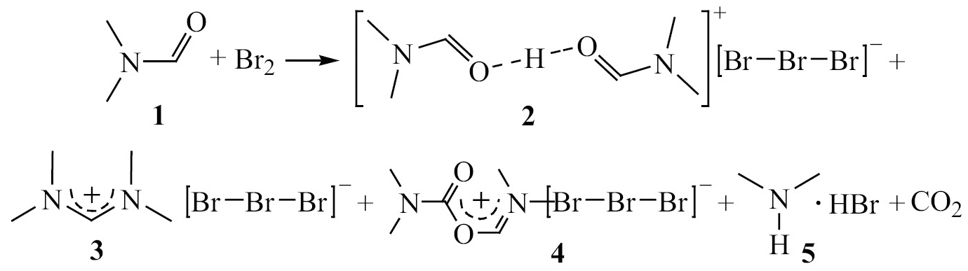С наибольшим выходом выделен дибромбромат бис(диметилформамид)водорода 2. Выход дибромбромата тетраметилформамидиния 3 становится существенным только при проведении реакции в сухих условиях (с осушенным ДМФА). Гидробромид диметиламина 5 получается при перекристаллизации первично образующегося полибромида диметиламмония, менее устойчивого по сравнению с продуктами 2 и 3. Выделяющийся в реакции СО2 охарактеризован хроматографически, его количество определялось волюмометрическим методом. Жидкий продукт 2 выделен и очищен перегонкой в вакууме, твердый дибромбромат N,N,N′,N′-тетраметилформамидиния 3 очищен перекристаллизацией.