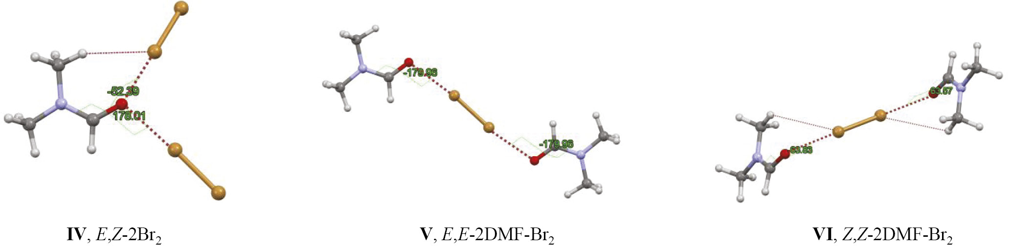 Комплексы другой стехиометрии (с соотношением ДМФА и Br2 1:2 и 2:1) пребывают в локальном минимуме только при координации по кислороду (рис. 2). В комплексе V все тяжелые атомы (включая бром) размещаются примерно в одной плоскости (MPP = 0.059 Å, размах отклонений – 0.181 Å). В комплексе VI вполне планарны оба фрагмента ДМФА. Два атома брома и четыре атома карбонильных групп также образуют плоскость (MPP = 0.013 Å, размах отклонений – 0.033 Å). В структуре VI на рис. 2 один из лигандов ДМФА обращен к молекуле брома гранью А, второй – гранью В (стереоизомер АВ). Стереоизомеры АА и ВВ не отличаются в длинах связей и энергиях образования.