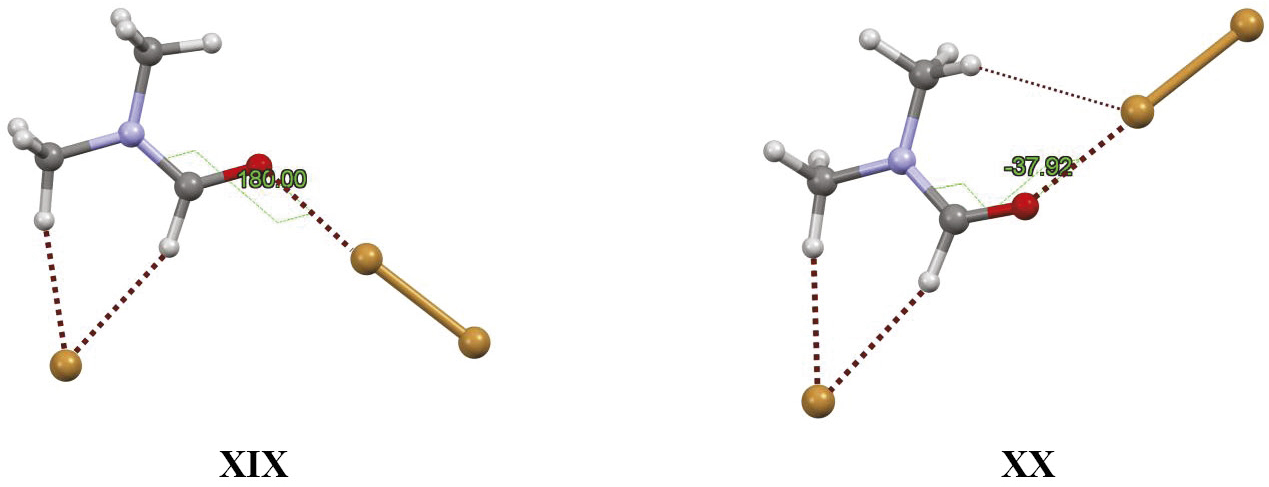 Вероятно, в силу разности наполнения области отрицательного электростатического потенциала проявляются только в окрестностях карбонильного атома кислорода (рис. S10a, см. Дополнительные материалы, сечение в плоскости молекулы ДМФА). Для изоповерхности с электронной плотностью 0.001 а. е. найдены несколько максимумов потенциала, и только один минимум потенциала (максимум отрицательного потенциала, рис. S10b, см. Дополнительные материалы). Этот минимум располагается в плоскости молекулы ДМФА, в транс-положении к атому азота.