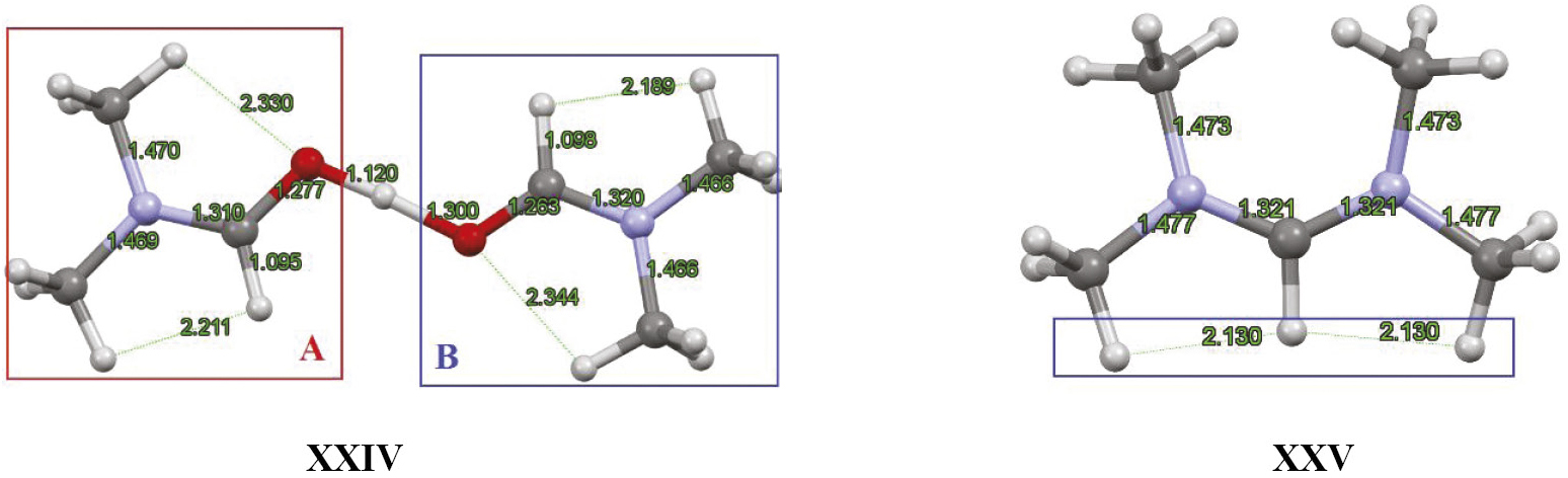 В предполагаемом интермедиате XXIII все неводородные атомы близки к созданию единой плоскости (MPP = 0.017). В кето-фрагменте А связи С=О и Ме2N–CO укорочены по сравнению с исходным ДМФА, связи Н3С-N удлинены; в эфирном фрагменте В межатомное расстояние С–О (бывшая связь С=О) увеличено по сравнению с ДМФА, связь Ме2N–CO укорочена, связи Н3С–N удлинены.