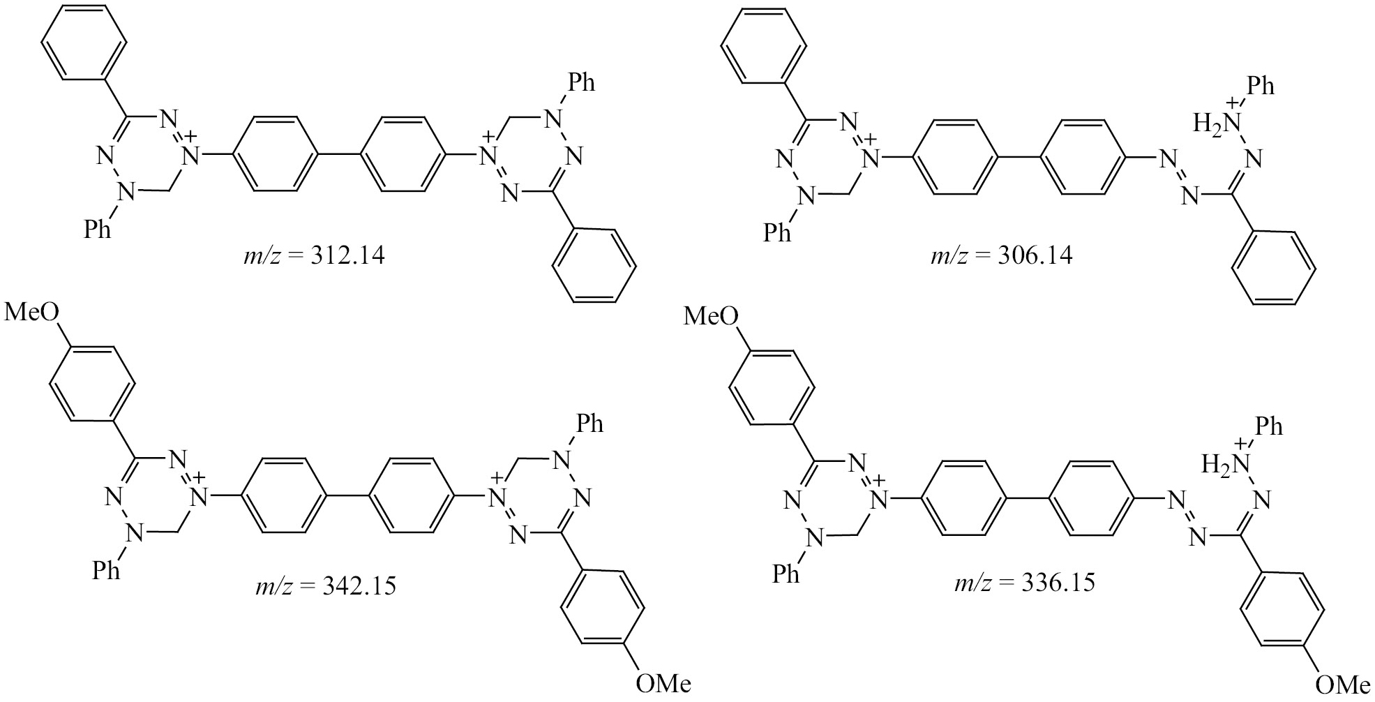 Бис(перхлорат) 1,1′-([1,1′-бифенил]-4,4′-диил)бис[3-(п-толил)-5-фенил-5,6-дигидро-1,2,4,5-тетразиния-1] (3б). Масс-спектр, m/z: 326.15. Rt = 18,9 мин.
