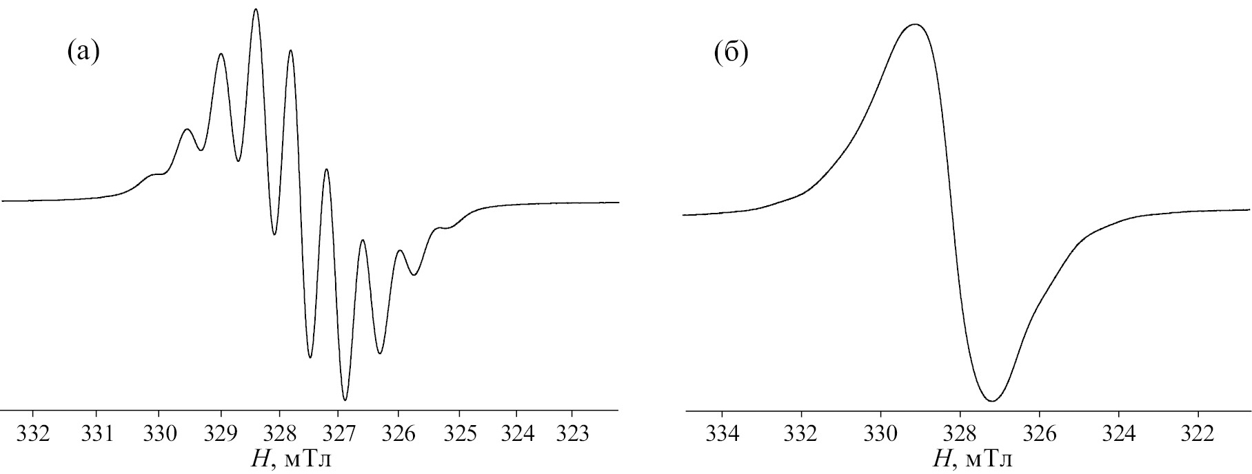 Рис. 4. Спектр ЭПР соединения 1в в бензоле (а) и твердой фазе (б) при комнатной температуре