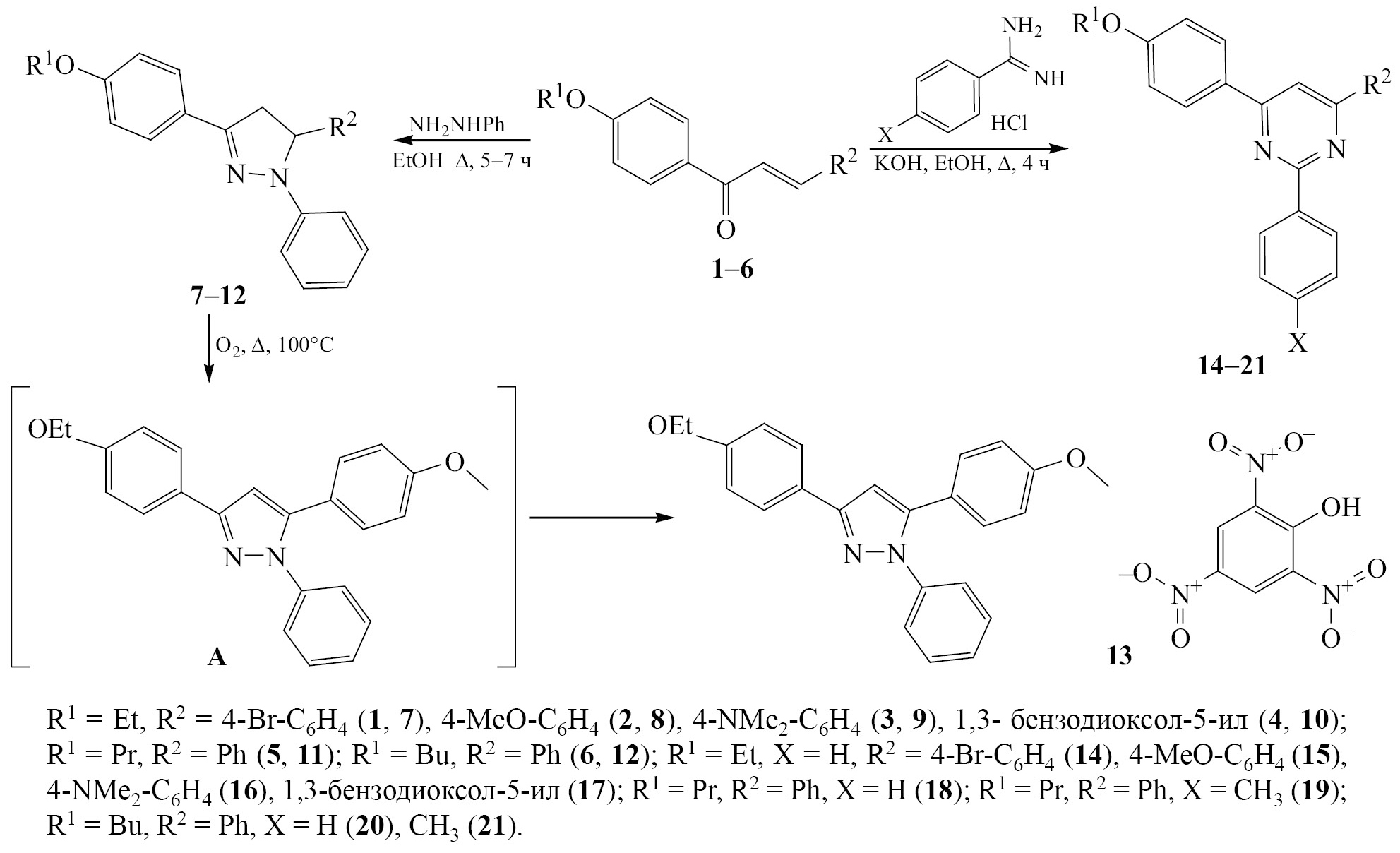 Реакция циклизации (Е)-3-арил-1-(4-алкоксифенил)проп-2-ен-1-онов 1–6 с фенилгидразином в кислой среде приводит исключительно к частично восстановленным производным – пиразолинам 7–12 (схема 1). Возможность получения соответствующих производных пиразола реализована путем барботирования воздуха через раствор 5-(4-метоксифенил)-1-фенил-3-(4-этоксифенил)-4,5-дигидро-1Н-пиразола 8 в этилцеллозольве, что привело к продукту окислительной ароматизации – пиразолу А. Последний получается в виде некристаллизующегося масла красно-багряного цвета и охарактеризован в виде пикрата 5-(4-метоксифенил)-1-фенил-3-(4-этоксифенил)-1Н-пиразола 13.