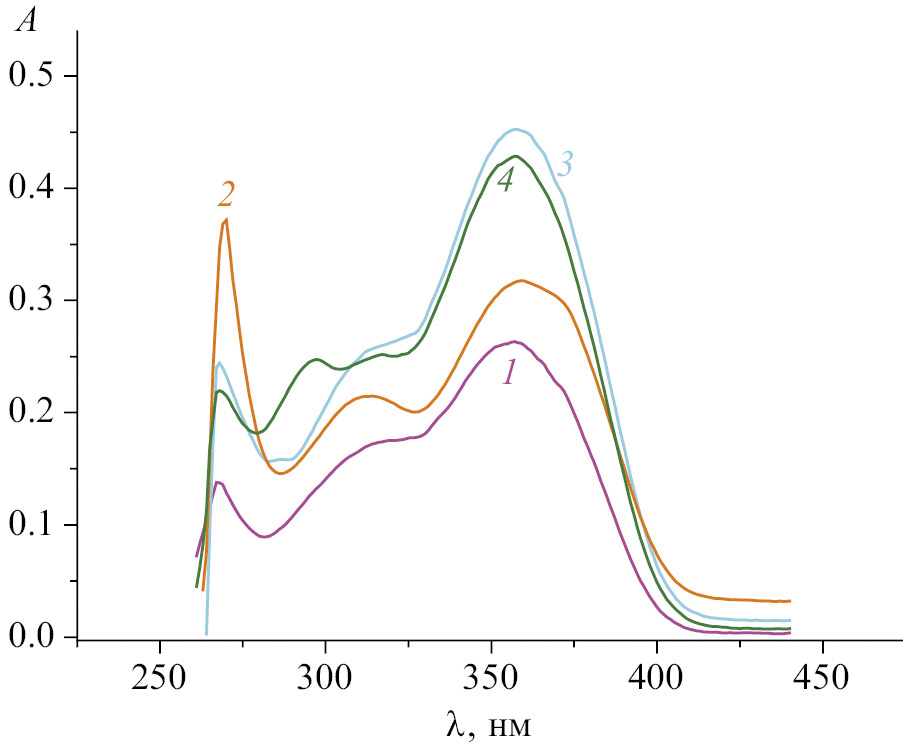 Рис. 3. Электронные спектры поглощения соединений 14–17 (1–4) в растворах ДМФА (c = 2·10–5 моль/л)
