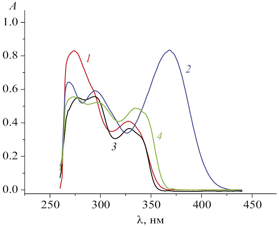 Рис. 1. Электронные спектры поглощения соединений 7–10 (1–4) в растворах ДМФА (c = 2·10–5 моль/л)
