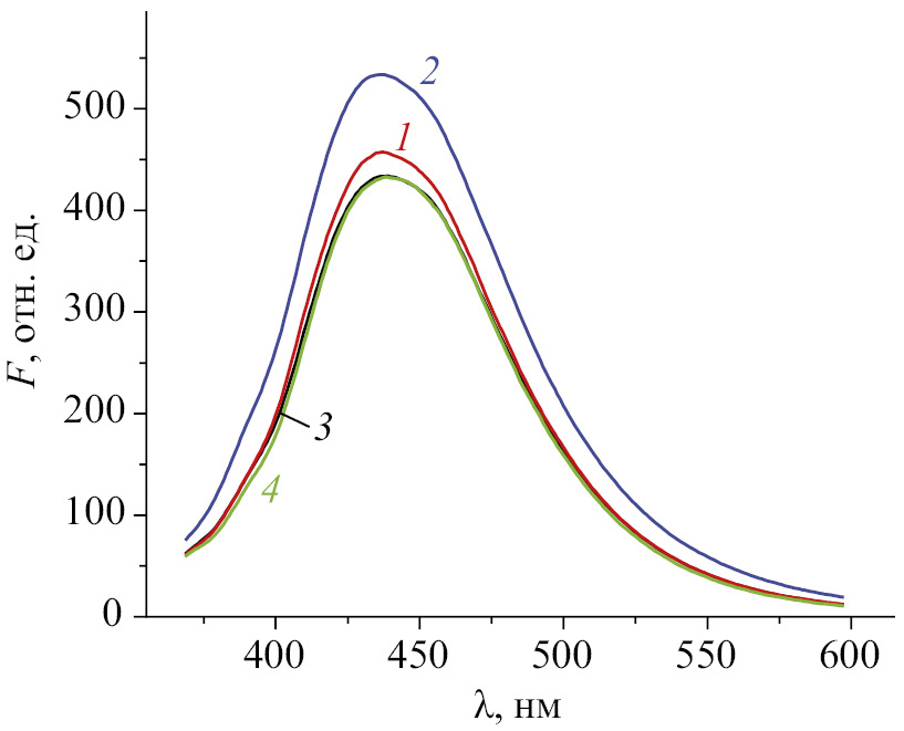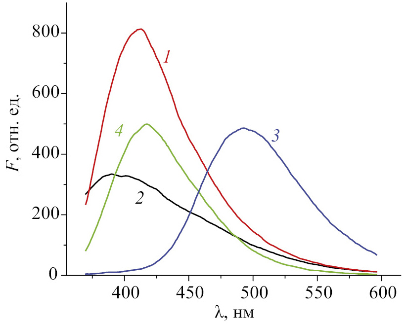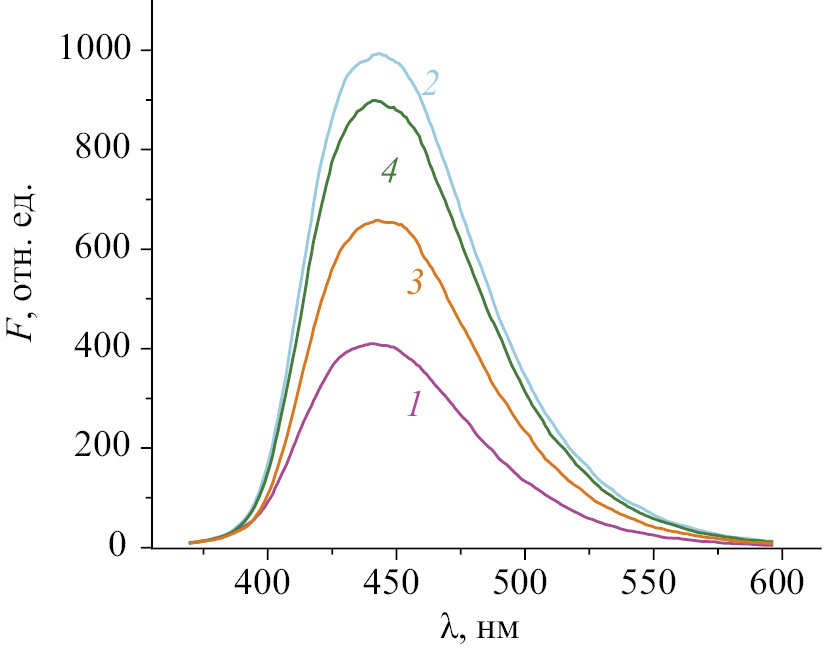 Рис. 5. Флуоресцентные спектры образцов 7–10 (1–4) в растворах ДМФА (ширина щели возбуждения – 5 нм, ширина щели излучения – 5 нм)