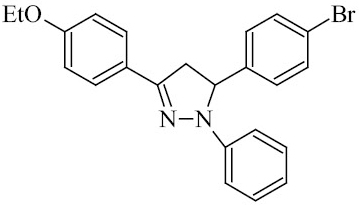 5-(4-Бромфенил)-1-фенил-3-(4-этоксифенил)-4,5-дигидро-1Н-пиразол (7). Выход 60%, т. пл. 144–146°С. ИК спектр, ν, см–1: 1595 (C=N). Спектр ЯМР 1H, δ, м. д.: 1.42 т (3H, CH3, J 7.0 Гц), 3.02 д. д (1H, CH2, J 17.1, 6.9 Гц), 3.87 д. д (1H, CH2, J 17.1, 12.2 Гц), 4.05 к (2H, ОCH2, J 7.0 Гц), 5.29 д. д (1H, CH, J 12.2, 6.9 Гц), 6.64–6.69 м (1H, C6H5), 6.83–6.88 м (2H, C6H4ОEt), 6.90–6.95 м (2H, C6H5), 7.04–7.10 м (2Н, C6H5), 7.22–7.26 м (2Н, C6H4Br), 7.42–7.46 м (2Н, C6H4Br), 7.57–7.62 м (2H, C6H4ОEt). Cпектр ЯМР 13С, δС, м. д.: 14.2 (CH3), 43.0 (CH2), 62.6 (CH), 62.7 (ОCH2), 112.6 (2CH), 113.9 (2CH), 118.1 (CH), 120.3, 124.5, 126.7 (2CH), 127.4 (2CH), 128.1 (2CH), 131.4 (2CH), 141.6, 144.3, 146.1, 158.9. Найдено, %: С 65.48; Н 5.12; N 6.60. C23H21BrN2O. Вычислено, %: С 65.57; Н 5.02; N 6.65.