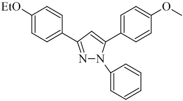 5-(4-Метоксифенил)-1-фенил-3-(4-этоксифенил)-4,5-дигидро-1Н-пиразол (8). Выход 80%, т. пл. 134–136°С. ИК спектр, ν, см–1: 1597 (C=N). Спектр ЯМР 1H, δ, м. д.: 1.42 т (3H, CH3, J 7.0 Гц), 3.02 д. д (1H, CH2, J 17.1, 7.0 Гц), 3.81 д. д (1H, CH2, J 17.1, 12.1 Гц), 3.75 с (3H, ОCH3), 4.05 к (2H, ОCH2, J 7.0 Гц), 5.22 д. д (1H, CH, J 12.1, 7.0 Гц), 6.62–6.68 м (1H, C6H5), 6.79–6.85 м (2H, C6H4), 6.82–6.88 м (2H, C6H4), 6.93–6.98 м (2H, C6H5), 7.04–7.10 м (2Н, C6H5), 7.18–7.23 м (2Н, C6H4ОМе), 7.58–7.63 м (2H, C6H4ОEt). Cпектр ЯМР 13С, δС, м. д.: 14.3 (CH3), 43.2 (CH2), 54.4 (ОCH3), 62.6 (CH), 63.0 (ОCH2), 112.6 (2CH), 113.8 (2CH), 113.8 (2CH), 117.8 (CH), 124.8, 126.4 (2CH), 126.6 (2CH), 128.0 (2CH), 134.2, 144.5, 146.0, 158.2, 158.8. Найдено, %: С 77.47; Н 6.42; N 7.46. C24H24N2O2. Вычислено, %: С 77.39; Н 6.49; N 7.52.