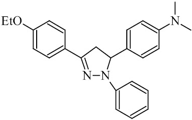 4-[3-(4-Этоксифенил)-1-фенил-4,5-дигидро-1Н-пиразол-5-ил]-N,N-диметиланилин (9). Выход 20%, т. пл. 150–152°С. ИК спектр, ν, см–1: 1598 (C=N). Спектр ЯМР 1H, δ, м. д.: 1.40 т (3H, CH3, J 7.0 Гц), 2.90 с (6H, NМе2), 3.00 д. д (1H, CH2, J 17.0, 7.0 Гц), 3.75 д. д (1H, CH2, J 17.0, 12.1 Гц), 4.03 к (2H, ОCH2, J 7.0 Гц), 5.14 д. д (1H, CH, J 12.1, 7.0 Гц), 6.57–6.68 м (3H, Аr), 6.81–6.86 м (2H, C6H4ОEt), 6.93–6.98 м (2H, C6H5), 7.01–7.12 м (4Н, Аr), 7.56–7.61 м (2H, C6H4ОEt). Cпектр ЯМР 13С, δс, м. д.: 14.3 (CH3), 40.1 (NМе2), 43.2 (CH2), 62.6 (CH), 63.1 (ОCH2), 112.7 (ш, 2CH), 112.7 (2CH), 113.8 (2CH), 117.6 (CH), 124.9, 126.1 (2CH), 126.5 (2CH), 128.0 (2CH), 130.2 (ш), 144.6, 145.9, 149.0 (ш), 158.7. Найдено, %: С 77.97; Н 7.14; N 10.84. C25H27N3O. Вычислено, %: С 77.89; Н 7.06; N 10.90.