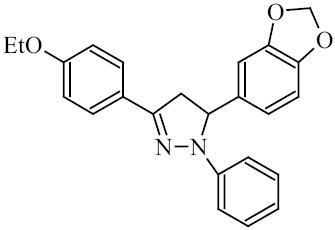 5-(1,3-Бензодиоксол-5-ил)-3-(4-этоксифенил)-1-фенил-4,5-дигидро-1Н-пиразол (10). Выход 80%, т. пл. 138–139оС. ИК-спектр, ν, см–1: 1596 (C=N). Спектр ЯМР 1H, δ, м. д.: 1.42 т (3H, CH3, J 7.0 Гц), 3.03 д. д (1H, CH2, J 17.1, 7.0 Гц), 3.81 д. д (1H, CH2, J 17.1, 12.1 Гц), 4.05 к (2H, ОCH2, J 7.0 Гц), 5.19 д. д (1H, CH, J 12.1, 7.0 Гц), 5.93 c (2H, ОCH2О), 6.64–6.70 м (1H, C6H5), 6.72–6.81 м (3Н, C6H3), 6.83–6.88 м (2Н, C6H4ОEt), 6.94–6.99 м (2Н, C6H5), 7.05–7.12 м (2Н, C6H5), 7.58–7.63 м (2H, C6H4ОEt). Cпектр ЯМР 13С, δС, м. д.: 14.2 (CH3), 43.2 (CH2), 62.6 (CH), 63.2 (ОCH2), 100.4 (ОCH2О), 105.6 (CH), 107.9 (CH), 112.6 (2CH), 113.8 (2CH), 117.9 (CH), 118.5 (CH), 124.7, 126.6 (2CH), 128.0 (2CH), 136.3, 144.4, 146.0, 146.3, 147.7, 158.8. Найдено, %: С 74.64; Н 5.68; N 7.31. C24H22N2O3. Вычислено, %: С 74.59; Н 5.74; N 7.25.