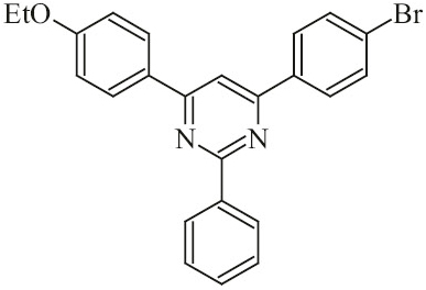 4-(4-Бромфенил)-6-(4-этоксифенил)-2-фенилпиримидин (14). Выход 30%, т. пл. 150–151°С. ИК спектр, ν, см–1: 1612, 1593 (C=C–C=N) . Спектр ЯМР 1H, δ, м. д.: 1.47 т (3H, CH3, J. 7.0 Гц), 4.14 к (2H, ОCH2, J 7.0 Гц), 6.98–7.03 м (2H, C6H4ОEt), 7.44–7.54 м (3H, C6H5), 7.65–7.70 м (2Н, C6H4Br), 8.22 с (1Н, СН), 8.31–8.36 м (2H, C6H4ОEt), 8.33–8.38 м (2Н, C6H4Br), 8.61–8.66 м (2H, C6H5). Cпектр ЯМР 13С, δС, м. д.: 14.3 (CH3), 62.7 (CH2), 108.7 (CH), 113.9 (2CH), 124.3, 127.6 (2CH), 127.8 (2CH), 128.5 (2CH), 128.6 (2CH), 128.7, 129.8 (CH), 131.2 (2CH), 136.0, 137.5, 160.8, 162.2, 163.2, 163.6. Найдено, %: С 66.91; Н 4.52; N 6.42. C24H19BrN2O. Вычислено, %: С 66.83; Н 4.44; N 6.49.