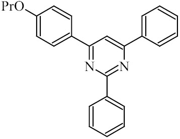 2-(4-Метилфенил)-4-фенил-6-(4-пропоксифенил)пиримидин (19). Выход 54%, т. пл. 110–111°С. ИК спектр, ν, см–1: 1605, 1586 (C=C–C=N). Спектр ЯМР 1H, δ, м. д.: 1.10 т (3H, CH3, J. 7.4 Гц), 1.80–1.92 м (2H, CH2), 2.47 с (3H, CH3Аr), 4.03 т (2H, ОCH2, J 6.5 Гц), 6.99–7.04 м (2H, C6H4ОРr), 7.26–7.31 м (2H, C6H4Ме), 7.47–7.60 м (3H, C6H5), 8.15 с (1Н, СН), 8.31–8.36 м (2H, C6H4ОРr), 8.33–8.39 м (2Н, C6H5), 8.52–8.57 м (2H, C6H4Ме). Cпектр ЯМР 13С, δС, м. д.: 10.1 (CH3), 20.9 (CH2), 21.9 (CH3), 68.7 (ОCH2), 108.5 (CH), 114.0 (2CH), 126.8 (2CH), 127.8 (2CH), 128.1 (2CH), 128.30 (2CH), 128.34 (2CH), 128.9, 129.9 (CH), 135.1, 137.0, 139.5, 160.8, 163.2, 163.34, 163.36. Найдено, %: С 81.98; Н 6.41; N 7.29. C26H24N2O. Вычислено, %: С 82.07; Н 6.36; N 7.36.