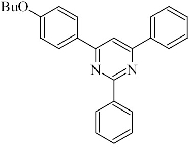 2,6-Дифенил-4-(4-бутоксифенил)пиримидин (20). Выход 60%, т. пл. 107–109°С. ИК спектр, ν, см–1: 1607, 1586 (C=C–C=N). Спектр ЯМР 1H, δ, м. д.: 1.03 т (3H, CH3, J. 7.4 Гц), 1.50–1.62 м (2H, CH2CH3), 1.77–1.86 м (2H, CH2C2H5), 4.07 т (2H, ОCH2, J 6.4 Гц), 6.99–7.04 м (2H, C6H4), 77.44–7.58 м (6H, Аr), 8.18 с (1Н, СН), 8.32–8.37 м (2H, C6H4), 8.35–8.40 м (2Н, C6H5), 8.64–8.69 м (2H, C6H5). Cпектр ЯМР 13С, δС, м. д.: 13.4 (CH3), 18.6 (CH2), 30.7 (CH2), 66.9 (ОCH2), 108.8 (CH), 114.0 (2CH), 126.8 (2CH), 127.6 (2CH), 127.8 (2CH), 128.1 (2CH), 128.3 (2CH), 128.8, 129.7, 129.9, 136.9, 137.7, 160.8, 163.1, 163.4. Найдено, %: С 82.13; Н 6.42; N 7.29. C26H24N2O. Вычислено, %: С 82.07; Н 6.36; N 7.36.