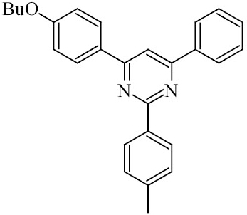 4-(4-Бутоксифенил)-2-(4-метилфенил)-6-фенилпиримидин (21). Выход 51%, т. пл. 114–115°С. ИК спектр, ν, см–1: 1607, 1586 (C=C–C=N). Спектр ЯМР 1H, δ, м. д.: 1.03 т (3H, CH3, J. 7.4 Гц), 1.49–1.62 м (2H, CH2CH3), 1.76–1.86 м (2H, CH2C2H5), 2.47 с (3H, CH3Аr), 4.07 т (2H, ОCH2, J 6.4 Гц), 6.99–7.04 м (2H, C6H4ОBu), 7.26–7.31 м (2H, C6H4Ме), 7.47–7.58 м (3H, C6H5), 8.15 с (1Н, СН), 8.31–8.36 м (2H, C6H4ОBu), 8.34–8.39 м (2Н, C6H5), 8.52–8.57 м (2H, C6H4Ме). Cпектр ЯМР 13С, δС, м. д.: 13.4 (CH3), 18.6 (CH3), 20.9 (CH2), 30.6 (CH2), 66.9 (ОCH2), 108.5 (CH), 114.0 (2CH), 126.8 (2CH), 127.8 (2CH), 128.0 (2CH), 128.31 (2CH), 128.33 (2CH), 128.9, 129.9 (CH), 135.1, 137.0, 139.4, 160.8, 163.2, 163.32, 163.34. Найдено, %: С 82.28; Н 6.70; N 7.05. C27H26N2O. Вычислено, %: С 82.20; Н 6.64; N 7.10.