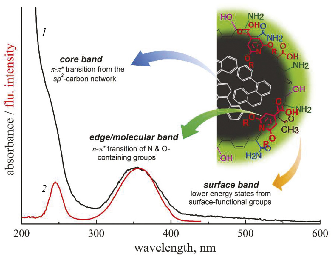 Несмотря на разнообразие структуры УТ, все они обычно обнаруживают сильные полосы поглощения в УФ диапазоне (230–320 нм), длинноволновое плечо которых находится в видимой области спектра и обусловливает желто-коричневую окраску дисперсий УТ. Поглощение в области 230–250 нм относится к π–π* электронным переходам ароматических C–C связей в ядре, тогда как полоса поглощения в области 300–350 нм (часто проявляющаяся как плечо) относится к n–π* переходам карбонильных или других функциональных групп [48]. Поверхностные функциональные (кислород-, азотсодержащие и др.) группы могут приводить к появлению и других полос поглощения в УФ и видимой областях спектра.