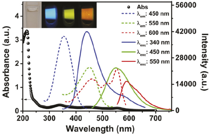 В работе [66] было изучено влияние продолжительности (от 8.6 до 11.4 ч) и температуры синтеза (от 160 до 200°C) на свойства УКТ, полученных сольвотермальной обработкой лимонной кислоты и мочевины в ДМФА (1 г : 0.5 г : 10 мл). В электронных спектрах полученных образцов проявлялись три характерные полосы поглощения, с максимумами около 340, 450 и 550 нм. Более подробно был изучен образец, полученный при температуре 166°C и продолжительности синтеза 11.4 ч. В нем были обнаружены наночастицы со средним диаметром 5.4 нм, с графитоподобным ядром. По данным ИК спектроскопии сделан вывод о присутствии в образце гидроксильных, карбоксильных, амидных и аминогрупп, а также сопряженных полиароматических фрагментов. Оптические свойства полученного образца УКТ проиллюстрированы на рис. 7. Полосы поглощения при 215 и 340 нм были отнесены к π–π* переходам π-электронной системы (графитовое ядро) и n–π*-переходам связей C=O и C=N (поверхностные состояния), соответственно, а полосы поглощения при 450 и 550 нм объяснялись присутствием флуоресцентных молекулярных фрагментов. При возбуждении светом с длиной волны 340, 450 и 550 нм в спектрах испускания наблюдались полосы с максимумами при 450, 550 и 600 нм, соответственно. Таким образом, был сделан вывод о присутствии в образце углеродных точек и флуоресцентных молекул.