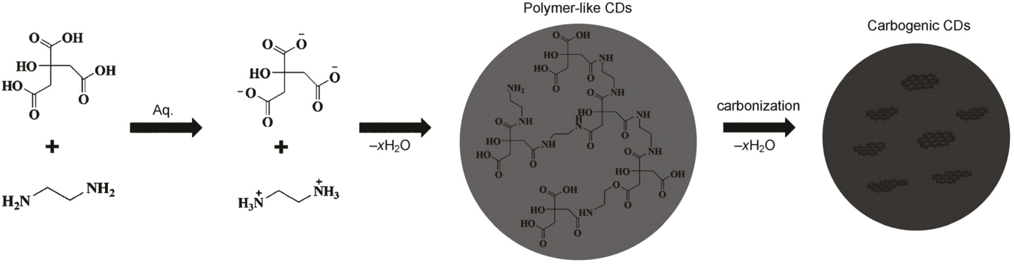 К настоящему времени этот механизм наиболее детально изучен для производных лимонной кислоты и различных прекурсоров ряда аминов. Например, в работе [65] путем гидротермальной обработки смесей лимонной кислоты с тремя различными аминами (этилендиамин, гексаметилентетрамин и триэтаноламин) были получены три вида УКТ (рис. 6). Анализ состава и строения УКТ показал, что в случае первичного амина (этилендиамин) и третичного амина, при нагревании разлагающегося с образованием аммиака (гексаметилентетрамин), полученные продукты характеризовались высоким квантовым выходом флуоресценции, а их оптические свойства были обусловлены присутствием производных цитразиновой кислоты (молекулярного флуорофора класса пиридинов). В то же время образование этого флуорофора в случае триэтаноламина невозможно, и полученные УКТ показали более низкий квантовый выход.
