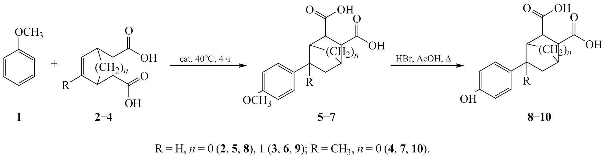 Нами предложен двухстадийный синтез ряда 4-(4-гидроксифенил)циклоалкандикарбоновых кислот (схема 1). В качестве исходного реагента нами был выбран анизол. В сравнении с фенолом анизол имеет ряд достоинств в реакции SEAr алкилирования: доступность, не высокая стоимость, стабильность, отсутствие необходимости использования растворителя, направление алкилирования в бензольное кольцо.
