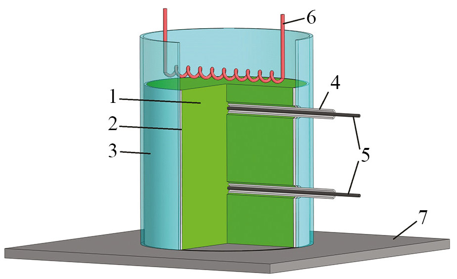 Рис. 2. Схема проведения экспериментов по измерению характеристик горения исследованных материалов: 1 – исходная заготовка, 2 – асбестовая изоляция, 3 – кварцевый стакан, 4 – керамическая трубка, 5 – термопары, 6 – инициирующая спираль, 7 – подложка.