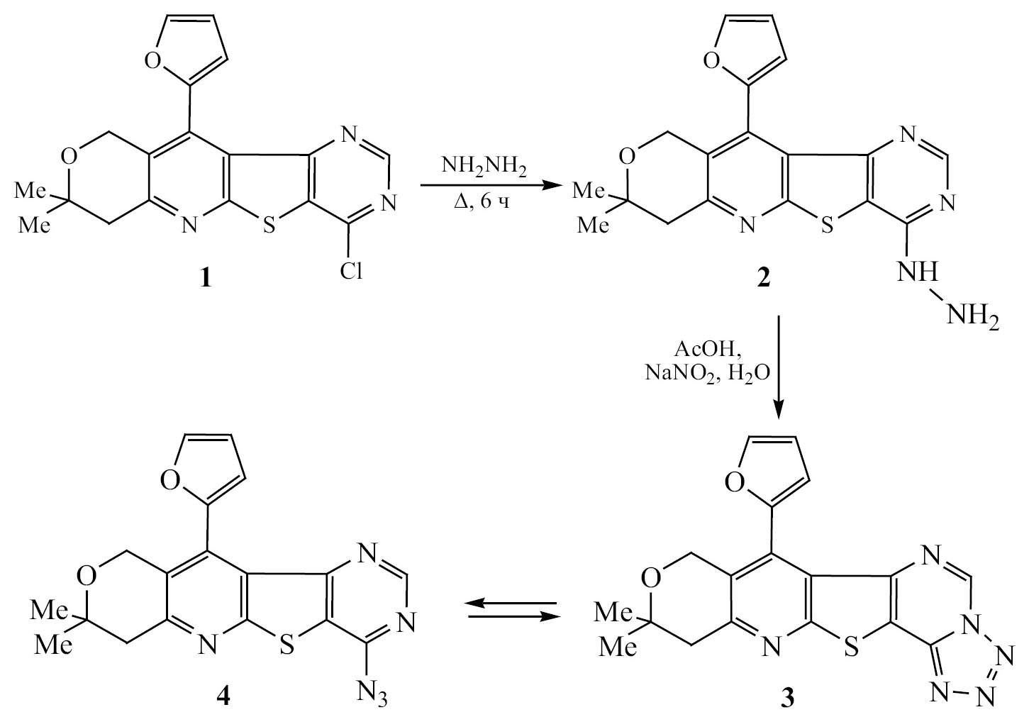 7-(2-Фурил)-10,10-диметил-10,11-дигидро-8H-пирано[3″,4″:5′,6′]пиридо[3′,2′:4,5]тиено[2,3-е]тетразолo[1,5-с]пиримидин (3). К суспензии 3.7 г (0.01моль) соединения 2 в 70 мл уксусной кислоты порциями добавляли раствор нитрита натрия, приготовленный растворением 5 г нитрата натрия в 25 мл воды. Реакционную смесь перемешивали в течение 48 ч при комнатной температуре. Выпавшие кристаллы отфильтровывали, промывали водой и перекристаллизовывали из ДМСО. Выход 3.6 г (94%), т. пл. 214–215°C, Rf 0.54 (пиридин–бутанол, 1:3). ИК спектр, ν, см⁻¹: 1620 (C=N), 1110 (тетразол). Спектр ЯМР ¹H (ДМСО-d6), δ, м. д.: 1.32 с [6H, C(CH₃)₂], 3.10 с (2H, 11-CH₂), 4.81 с (2H, 8-CH₂), 6.80 д. д (1H, CH⁴фурил, J 3.3, 1.8 Гц), 6.99 уш. д (1H, CH³фурил, J 3.3 Гц), 7.96 уш. д (1H, CH⁵фурил, J 1.8 Гц), 10.10 с (1H, 5-CH). Спектр ЯМР ¹H (CDCl₃), δ, м. д. (смесь азида и тетразола): 1.40 c и 1.42 с [6H, C(CH₃)₂), 3.11 с и 3.16 с (2H, 11-CH₂), 4.90 с и 4.93 с (2H, 8-CH₂), 6.69 д. д и 6.71 д. д (1H, CH⁴фурил, J 3.4, 1.8 Гц), 6.76 д. д и 6.89 д. д (1H, CH³фурил, J 3.4, 0.7 Гц), 7.70 д. д и 7.71 д. д (1H, CH⁵фурил, J 1.8, 0.7 Гц), 8.85 с и 9.48 с (1H, 5-CH). Спектр ЯМР ¹³C (CDCl₃), δС, м. д.: 26.7 [C(CH₃)₂], 44.0 (11-CH₂, азид), 44.1 (11-CH₂, тетразол), 61.3 (8-CH₂, азид), 61.5 (8-CH₂, тетразол), 71.4 [C(CH₃)₂, азид], 71.5 [C(CH₃)₂, тетразол], 111.4 (CH⁴фурил, азид), 111.5 (CH⁴фурил, тетразол), 113.5 (CH³фурил, азид), 114.3 (CH³фурил, тетразол), 118.3, 123.1, 126.7, 127.6, 132.9 (азид), 133.6 (тетразол), 134.1, 143.7 (CH, азид), 143.8 (CH, тетразол), 145.0 (CH, азид), 145.2 (CH, тетразол), 145.4 (CH, азид), 146.8 (CH, тетразол), 154.5 (CH⁵фурил), 157.4 (азид), 158.2 (тетразол), 161.1 (азид), 162.0 (тетразол). Найдено, %: С 57.19; H 3.69; N 22.25; S 8.51. C18H14N6O2S. Вычислено, %: С 57.13; H 3.73; N 22.21; S 8.47.