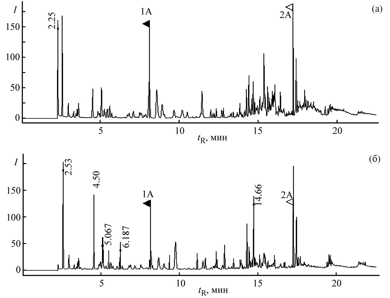 Рис. 1. Масс-хроматограммы образцов Отг 1 (а) и Отг 2 (б).