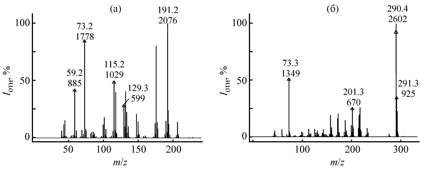 При рассмотрении масс-спектров соединений, содержащихся в отгонах, нами также были обнаружены наборы соединений и их изомеры с числом атомов кремния до 7, что совпадает с данными работы [21].