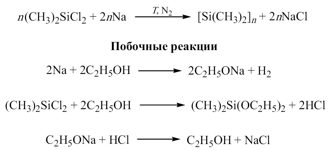 На завершающих стадиях процесса получения полидиметилсилана [18] происходит дезактивация остатков натрия спиртом и промывание продукта дистиллированной водой. В случае присутствия в реакционной массе остаточных хлорсилильных групп протекают побочные реакции, в результате которых образуются кремнийорганические кислородсодержащие продукты (схема 1).