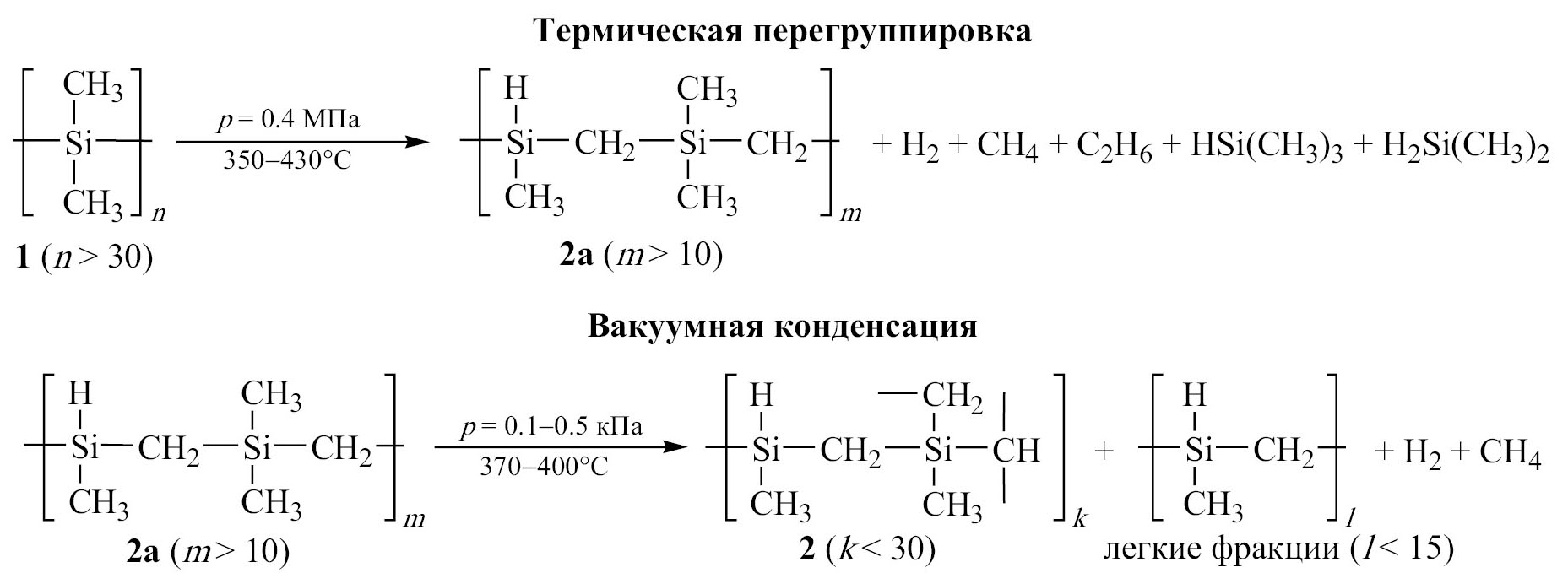 При пиролизе полидиметилсилана 1 образуется поликарбосилан [поли(олиго)карбосилан, 2], а также некоторое количество газообразных продуктов (главным образом водород, метан и небольшие количества предельных и непредельных углеводородов С2–С4) и жидких низкомолекулярных фракций, отгоняющихся в процессе перегруппировки (схема 2). Получаемый поли(олиго)карбосилан довольно легко взаимодействует с кислородом и влагой воздуха даже при непродолжительном контакте при перезагрузке и отборе проб. В связи с этим все технологические этапы должны проводиться в инертной осушенной атмосфере.