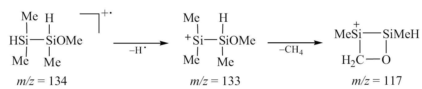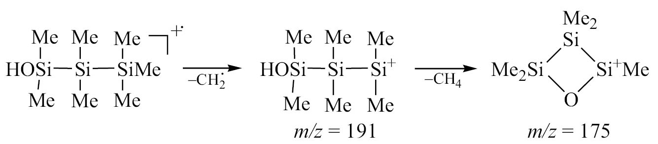 На рис. 1 показано совпадение по качественному составу соединений в образцах Отг 1 и Отг 2. Например, в точках 1А на обеих масс-хроматограммах присутствует соединение с массой 206. Его можно представить, как НОMe2SiSiMe2SiMe3. Из него при элиминировании радикала СН3• появляется катион с m/z = 191 [M – 15]+, а дальнейший отрыв водорода от ОН-группы при одном атоме кремния и метильной группы при другом приводит образованию катиона с m/z = 175 с атомом кислорода в цикле (схема 3).