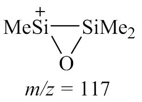 3.12 | 4.72 | 192 | 192 (8) [M]+·, 191 (30), 179 (12), 178 (18.8), 177 (100) [M – 15]+, 149 (41), 135 (22), 133 (31), 131 (18), 117 (37), 73 (86), 59 (19), 45 (12) | Me3SiOSiMe2SiMeH2 | 12/1 | |||