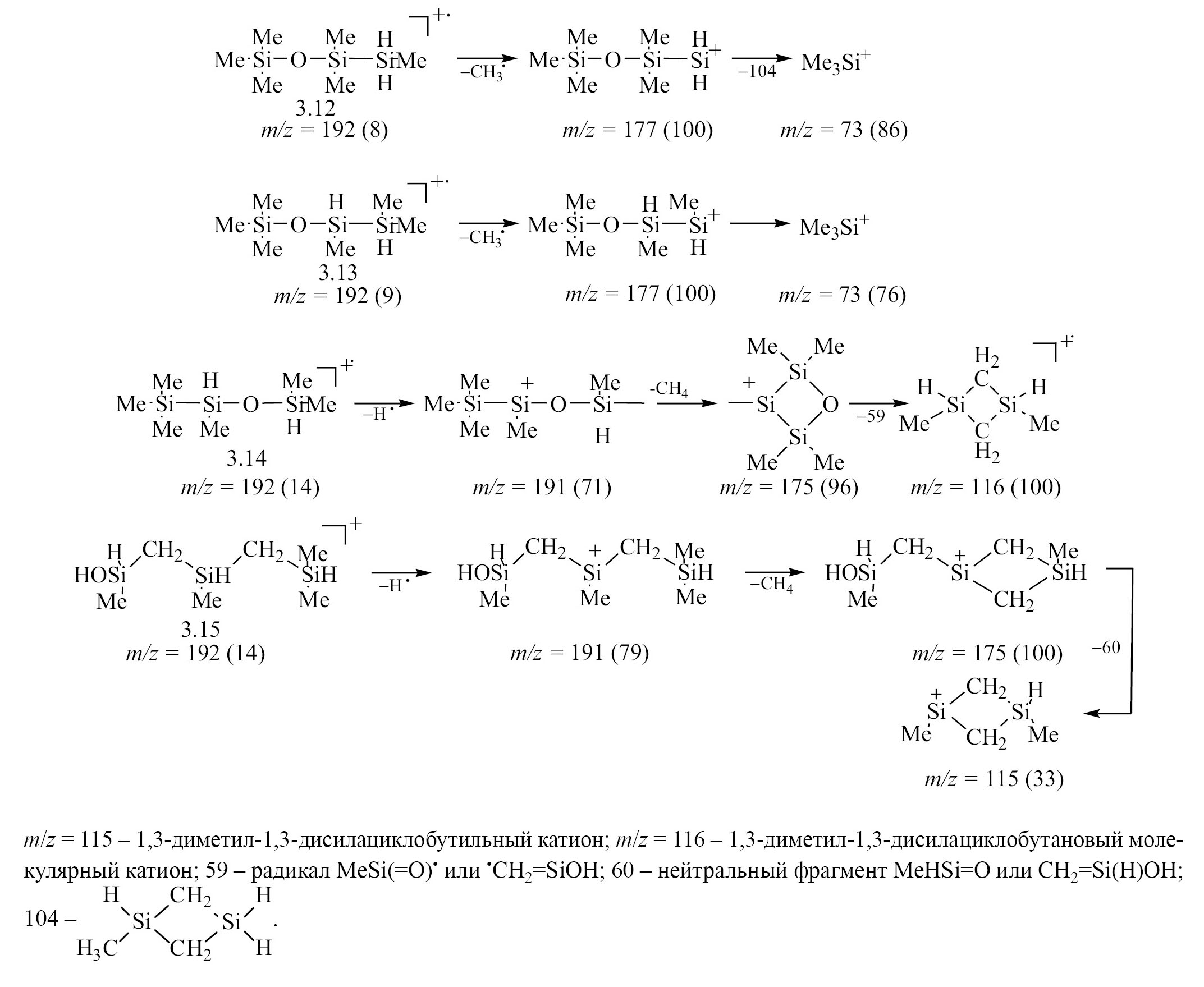 Соединения с тремя атомами кремния. В табл. 3 соединения 3.12–3.15 имеют молекулярные массы 192 Дa. Этими соединениями могут быть линейные молекулы Me3SiOSiMe2SiMeH2, Me3SiOSi(MeH)SiMe2H, Me3SiSi(MeH)ОSiMe2H, HMe2SiSiMe2ОSiMe2H [21, с. 273–274]. Из молекул, в которых присутствуют силоксановые связи, в условиях ЭИ могут образовываться максимальной интенсивности катионы с m/z = 177 (100) [M – CH3]+. Это наблюдается для молекул 3.12 и 3.13. Изменение расположения кислорода в соединениях 3.14 и 3.15 приводит к другим схемам фрагментации (схема 6).