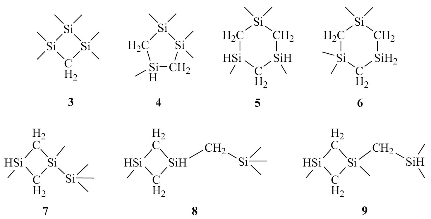 Следующий набор соединений содержит молекулы с массой 188. Их масс-спектры не найдены в базе NIST 11, поэтому нами предложен возможный набор из 7 молекул (схема 7). Авторы [25] идентифицировали соединение 7 из этого набора как 1,3-диметил-1-(триметилсилил)-1,3-дисилациклобутан.